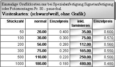 [Wunderli Grafik, Druck, Visitenkarten] [Informationen über uns] [Technische Infos] [Visitenkarten] [Schriftauswahl] [VK-Box] [VK-Muster] [Geschäftspapier] [Kuverts] [Etiketten] [Flugblätter] [Bierpass usw.] [Menükarten] [Kleber] [Karten] [Website-Gestaltung] [Bestellung] [AGB]